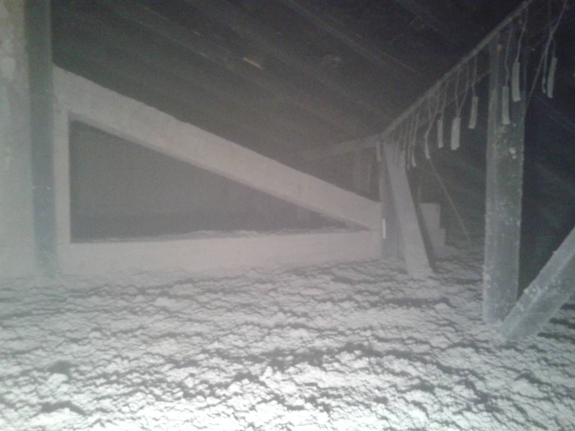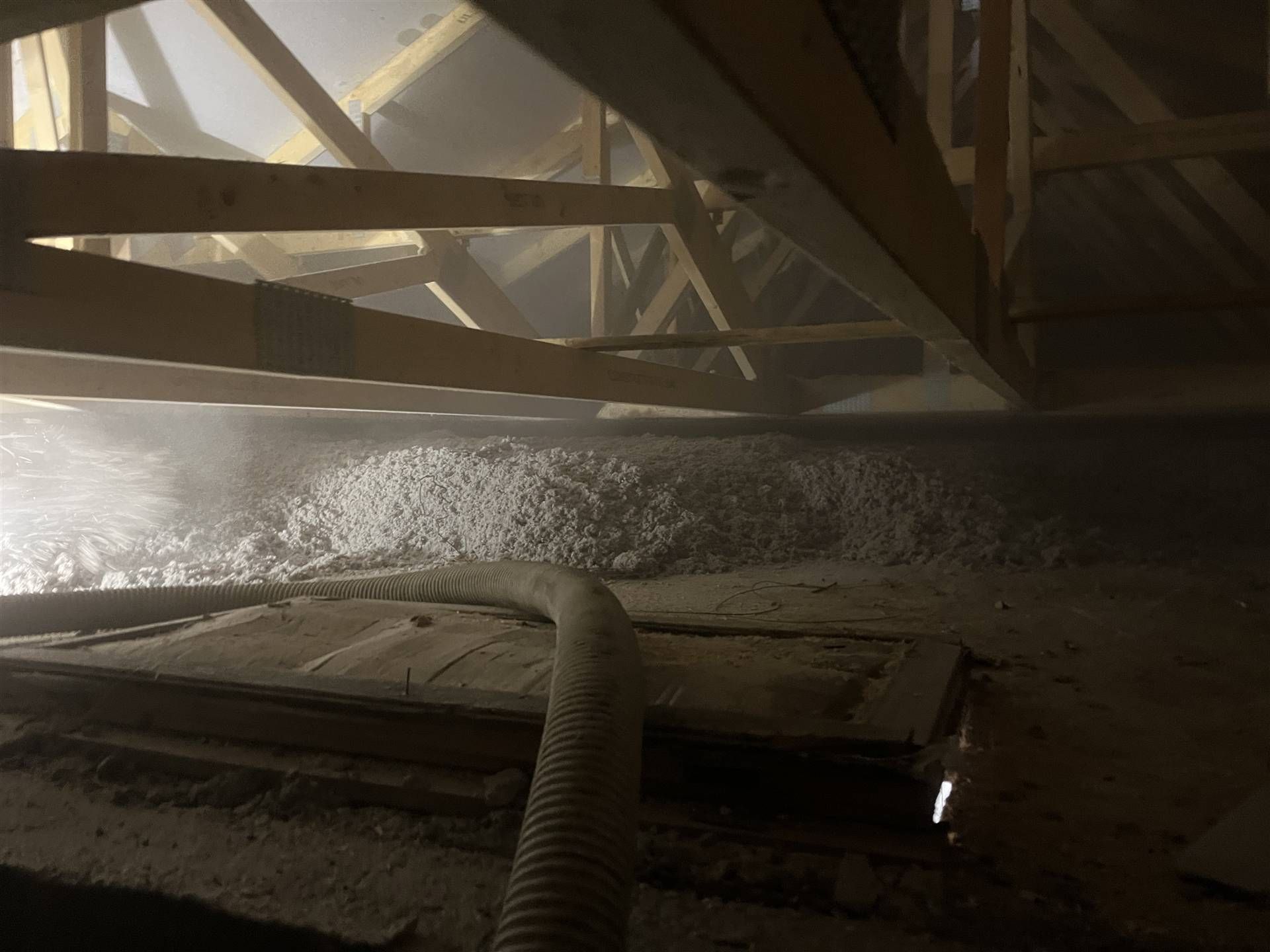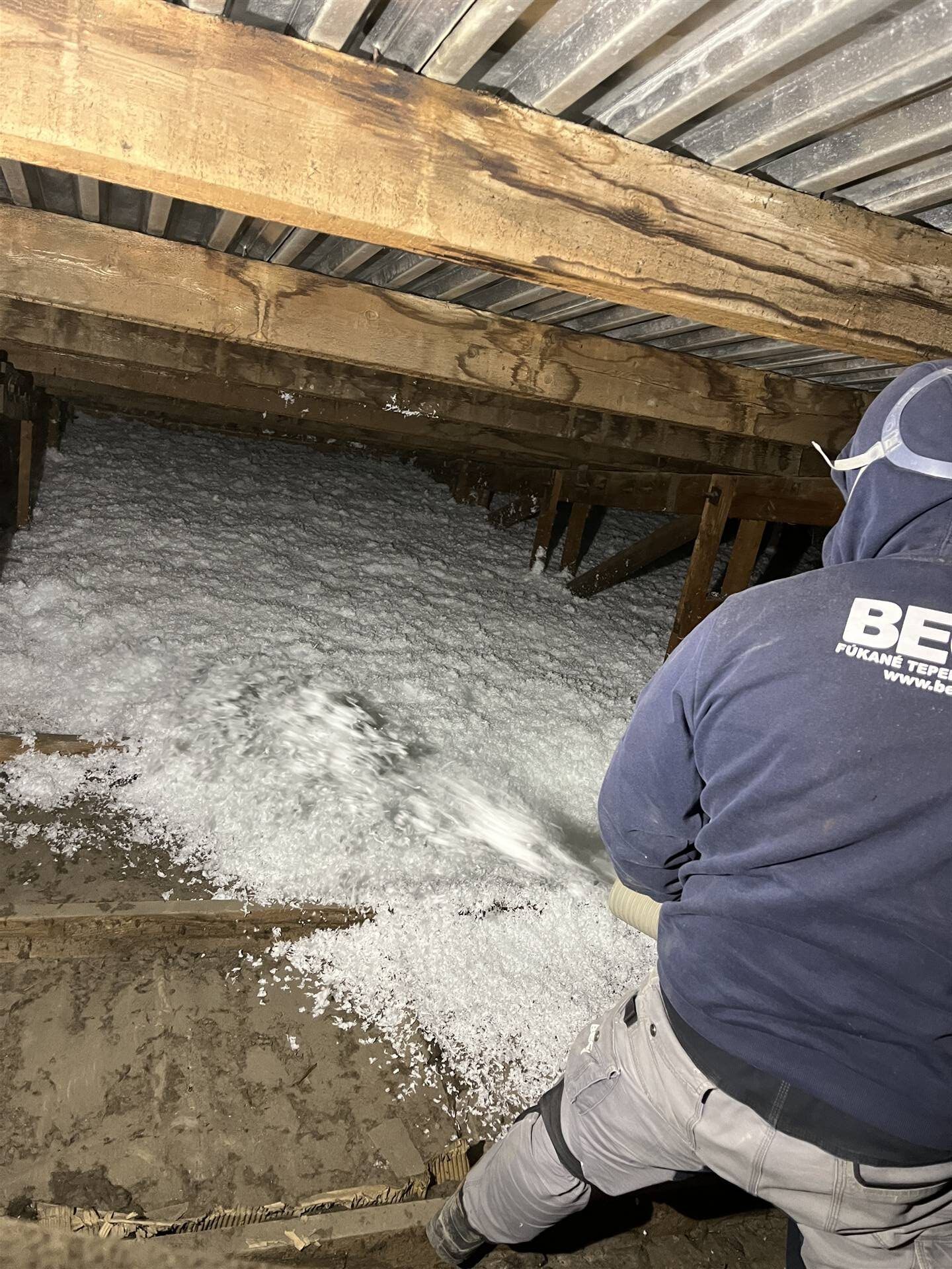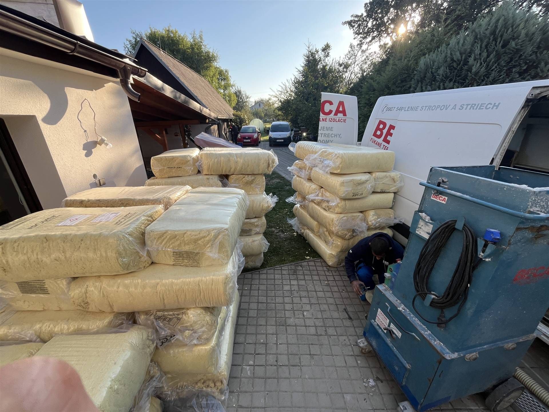Dosť často by to ani nebolo možné, lebo takéto podhľady majú malú únosnosť „nieje jedno kde stúpite“.  Pri použití fúkanej izolácie je dopravovaný materiál po hadici. Netreba nič vynášať. Výsledná nafúkaná vrstva izolácie dokonale „bezšpárovo“ vyplní zateplovanú plochu. Takto dokážeme eliminovať všetky tepelné mosty.